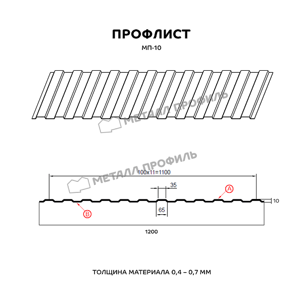 Профиль МП-10:Один из популярных видов профнастила категории «стеновой». Он отличается низкой высотой волны – 10 мм и симметричным рисунком. пропорциям, МП-10 имеет широкую сферу применения. Чаще всего этот профнастил востребован для постройки стен и перегородок, обшивки фасадов жилых и коммерческих зданий, возведения заборов, а также как материал подвесного потолка в промышленных сооружениях. Для производства указанного профиля берётся высококачественная холоднокатаная сталь 0,4-0,7 мм толщиной. Металлическая основа покрывается цинком, а также обрабатывается полимерным составом. Протекторное полимерное покрытие удачно дополнит цветовую палитру вашего объекта. К тому же оно обеспечит изделию дополнительную защиту от влажности, выгорания, механических воздействий.